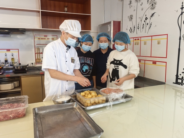 参观环节结束后,活动进入实践体验环节。在食堂三楼共享厨房,学生代表们在厨师长的指导下学习家常菜制作。从食材配比、刀工处理到火候掌控、调味技巧,同学们认真聆听、跃跃欲试。计算机学院的陈同学初次尝试烹饪酿豆泡,虽然动作略显生疏,但在厨师的耐心指导下,最终完成了一道色香味俱全的菜肴。“实际炒菜比想象中难多了,厨师们每天做这么多道菜真的很辛苦!”陈同学感慨道。