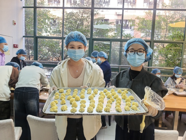 在点心制作区,工作人员示范了饺子、泡芙、曲奇等中西式面点的制作技巧。饺子的包馅、塑形,曲奇的挤料、裱形,同学们纷纷动手尝试。珠宝学院的高同学虽然手上沾满面粉,却难掩兴奋之情:“第一次亲手做曲奇,虽然形状有点‘独特’,但非常有成就感!”烹饪体验实践现场欢声笑语,其乐融融。